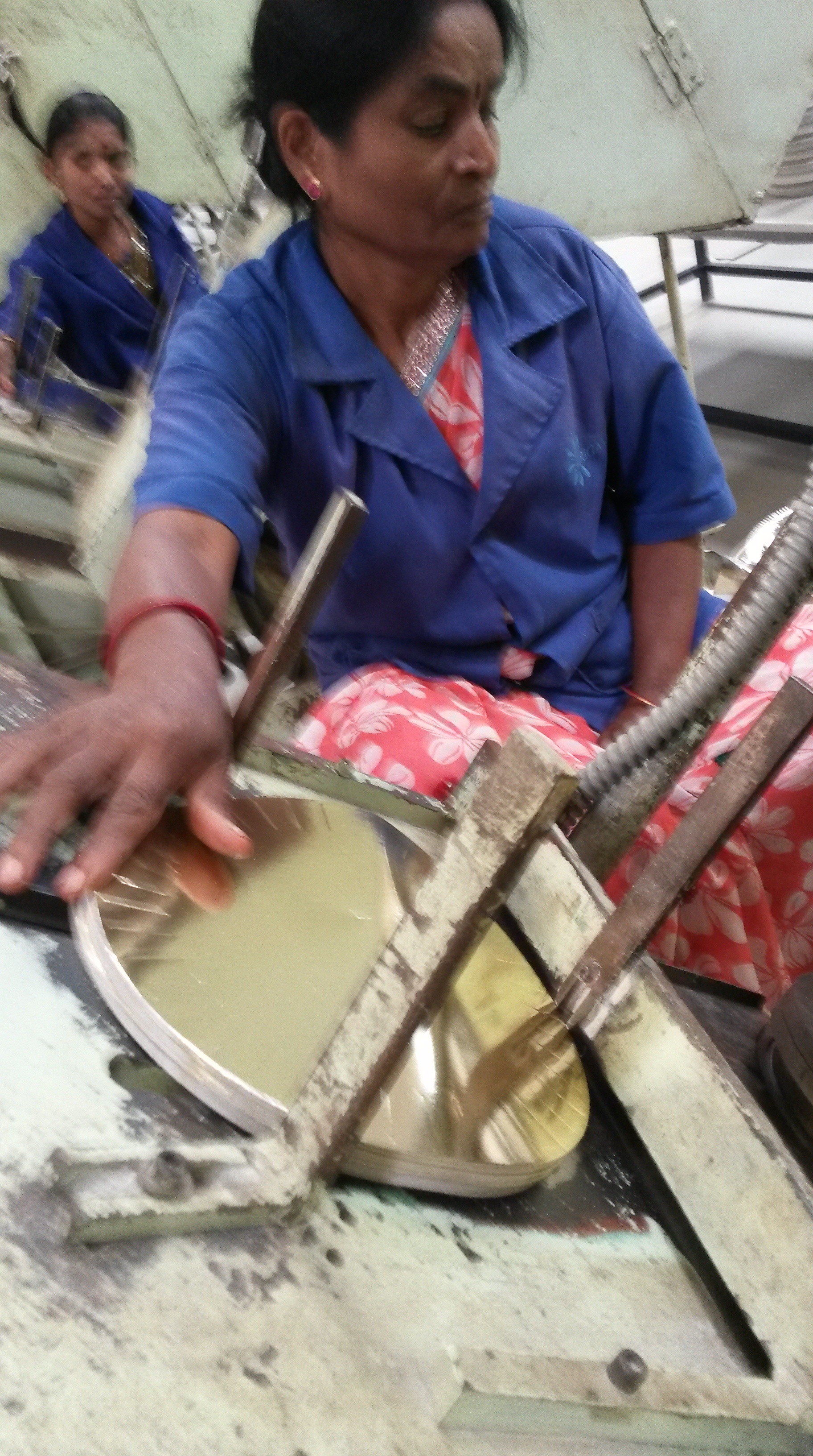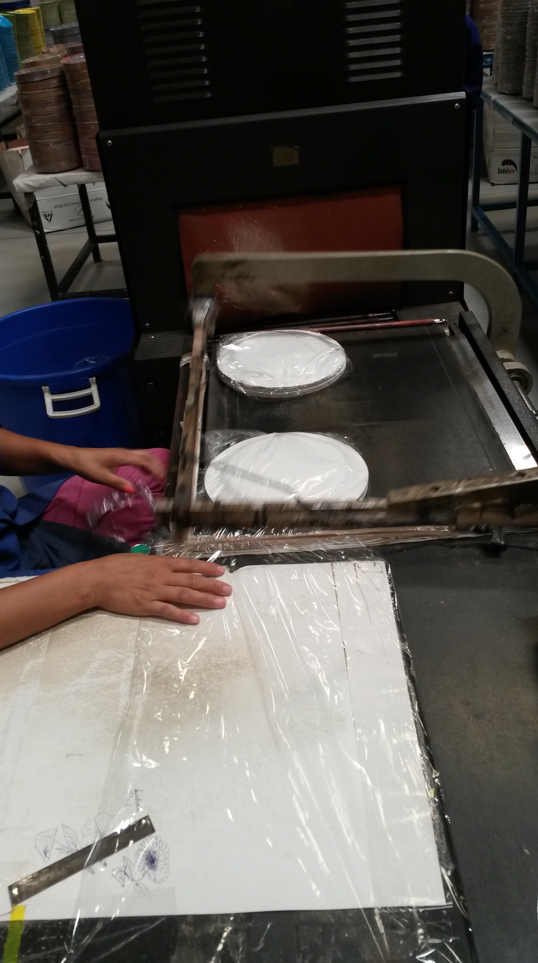 4. The plates are then manually counted and wrapped in shrink wrap before being sealed with a hand sealing machine. The machine applies heat onto the shrink wrap and melts it. Thus, the shrink wrap gets cut off and wraps the plate, as the picture shows.