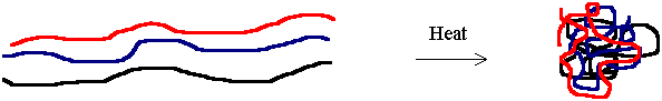 So how does shrink wrap work? Shrink wrap is made out of polymers (a long chain of small molecules that combine to form a macromolecule) that are oriented in an elongated state, as shown below. However, on the application of heat, the polymers break out of this elongated state and become entangled. As a result, the shrink wrap shrinks and firmly wraps around the plates.