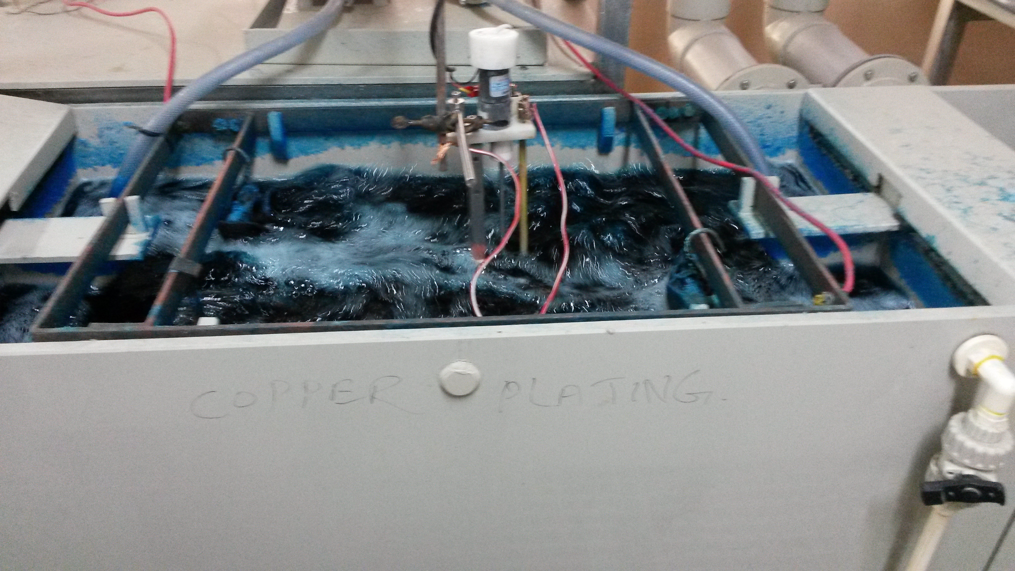 The image below shows the process in action. As you can see, the electrolyte is continuously stirred to ensure the concentration of copper ions throughout the solution remains constant, which in turn helps ensure that copper is evenly electroplated over the substrate.