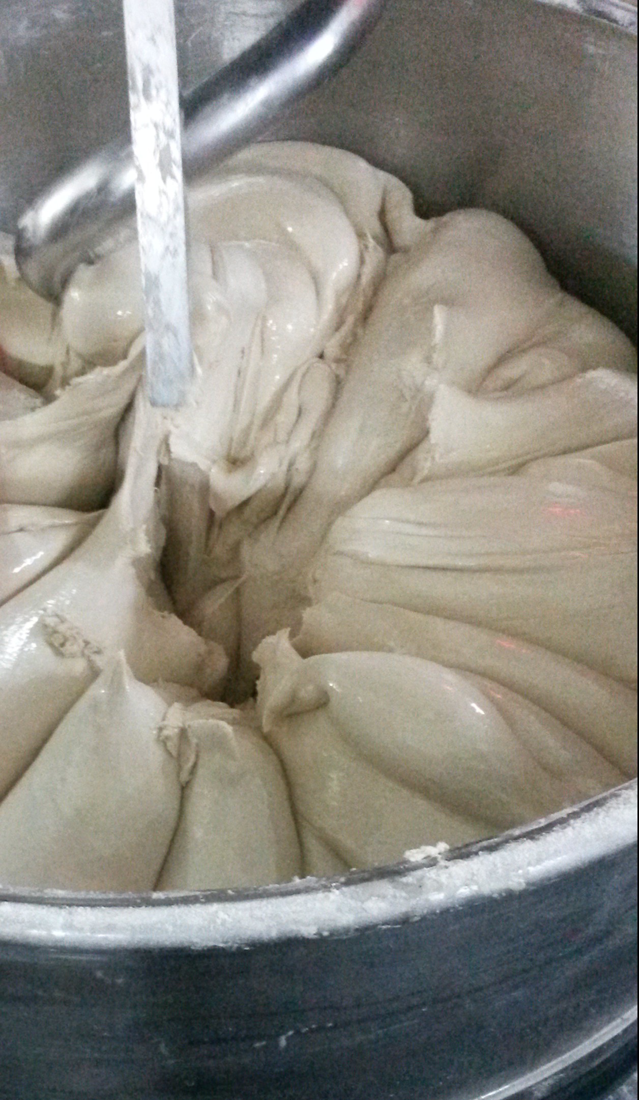 The ingredients to make the bread, including flour, water, oil and yeast, are mixed together in the desired ratio (depends on the bread being made), as shown below.