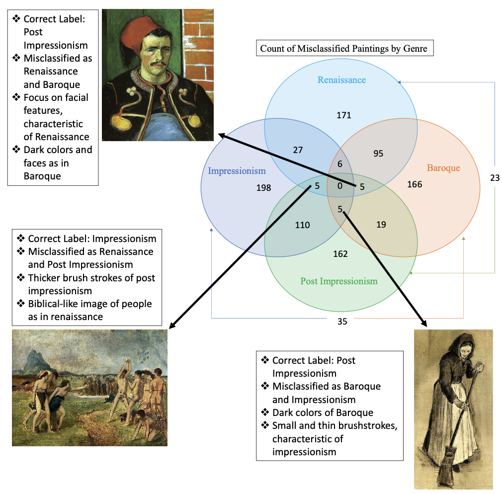 In examining some of the failure cases, it was found that there were clearly human-identifiable features in paintings that correspond to the incorrect classification.