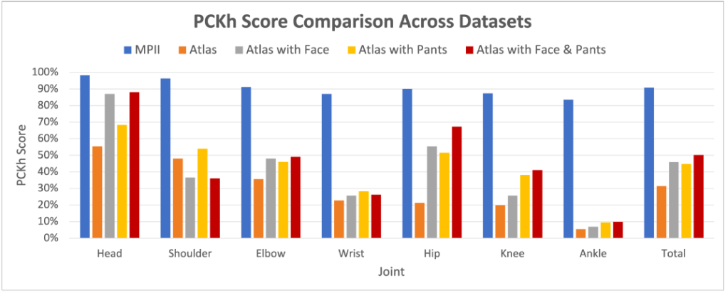 We noticed that the network performed poorly on just the images of Atlas, indicating that it must use distinctly human features to predict pose. To test this hypothesis we programmatically added pants and a face onto Atlas, which increased the performance of the network! This indicated that the network identified features such as clothing and facial structures to then infer pose, which provides added interpretability to what was a black box.