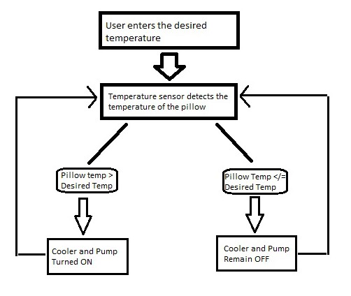 As shown, the cooler and pump is only turned on if the temperature sensor detects that the pillow’s temperature is higher than the desired temperature.